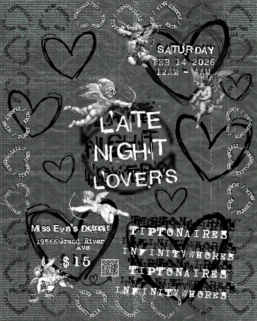 TIPTONAIRES & INFINITY WHORES bring you ⏰ LATE NIGHT LOVERS ⏰ an after hours techno affair. 🎧 PLANET KAIA & ALMIGHTY LEO & TIPTONAIRES 🎧 will be spinning all night. 🔮 SELF PULL LOVE TAROT will be available to see if you'll find your soulmate on the dance floor or if you need to take some time and see a love doctor. Gifts from sponsors will, be available.