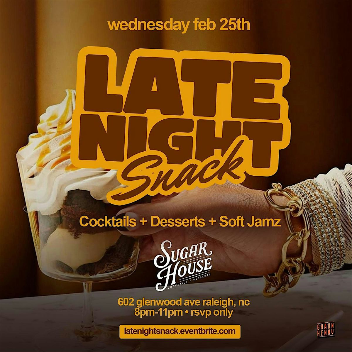Late Night Snack is a Mid-Week vibe that brings together Craft Cocktails, Indulgent Desserts, and laid-back Tunes for a smooth Wednesday night out. Come Sip, Indulge, in a Cozy, Social Atmosphere. Perfect for Unwinding, Mingling, and enjoying the Sweeter Side of the night.