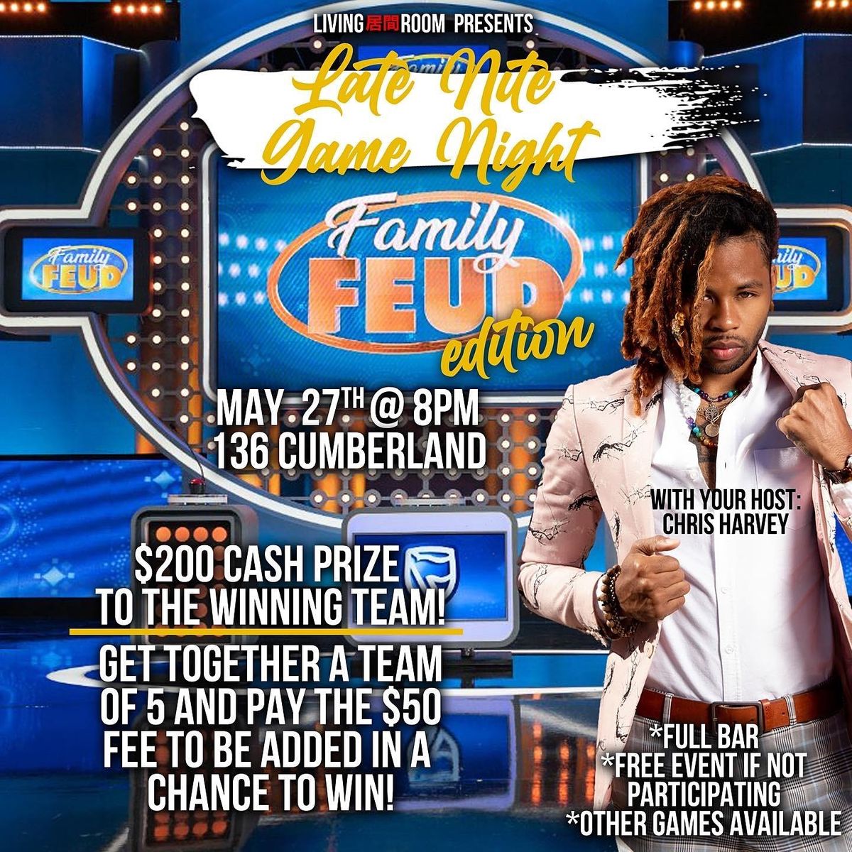 There will be board games such as Uno, playing cards, drunk jenga, taboo, battleship, monopoly, and even a N64! But the real star of the night will be the live family feud game we will be playing! Teams have signed up to go head to head for $200 cash, a trophy, bragging rights, and free entry and a shot at another $200 for the next time we play! Anyone not participating gets in free! Team sign up is $50 for a team of 5 just message me to get signed up! Deadline to sign up is Thursday May 26th!