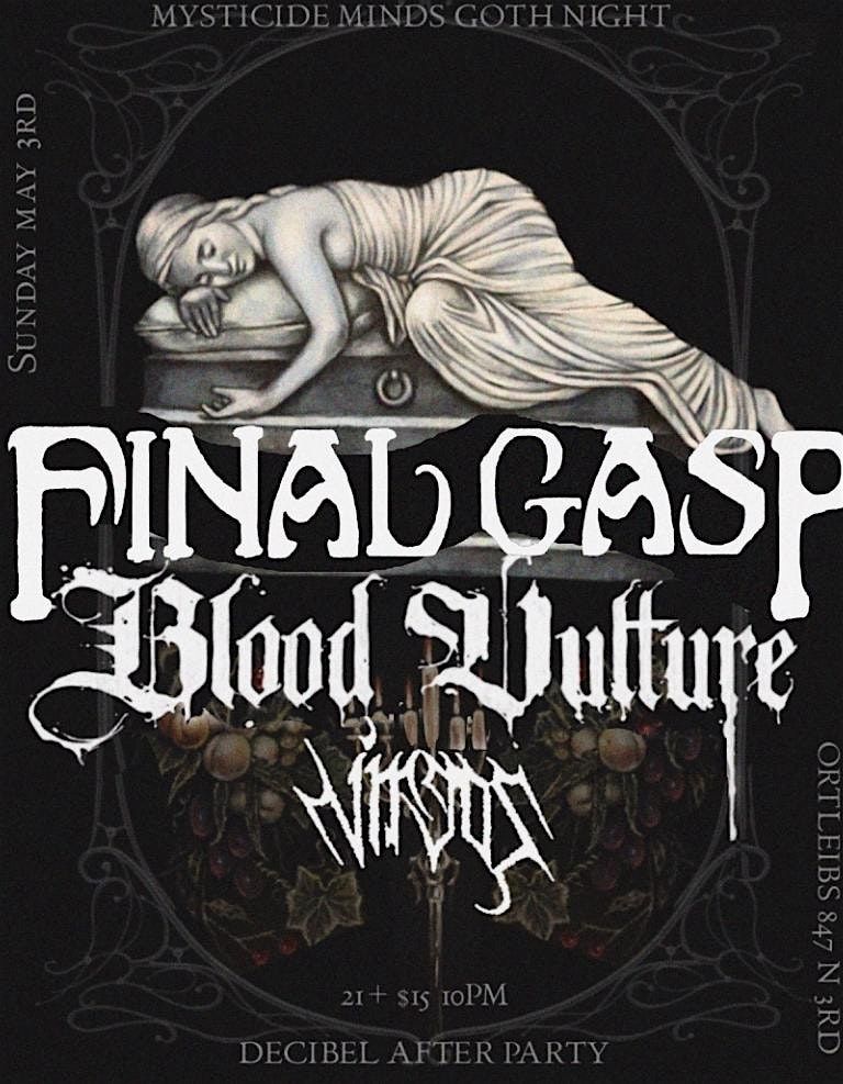 Get ready for an epic night with Final Gasp, Blood Vulture, and The Virgos live in person! This is your chance to catch some killer tunes and vibe with the crowd. Don't miss out on the raw energy and unforgettable performances that these bands bring to the stage. Gather your friends, rock out, and make some memories!