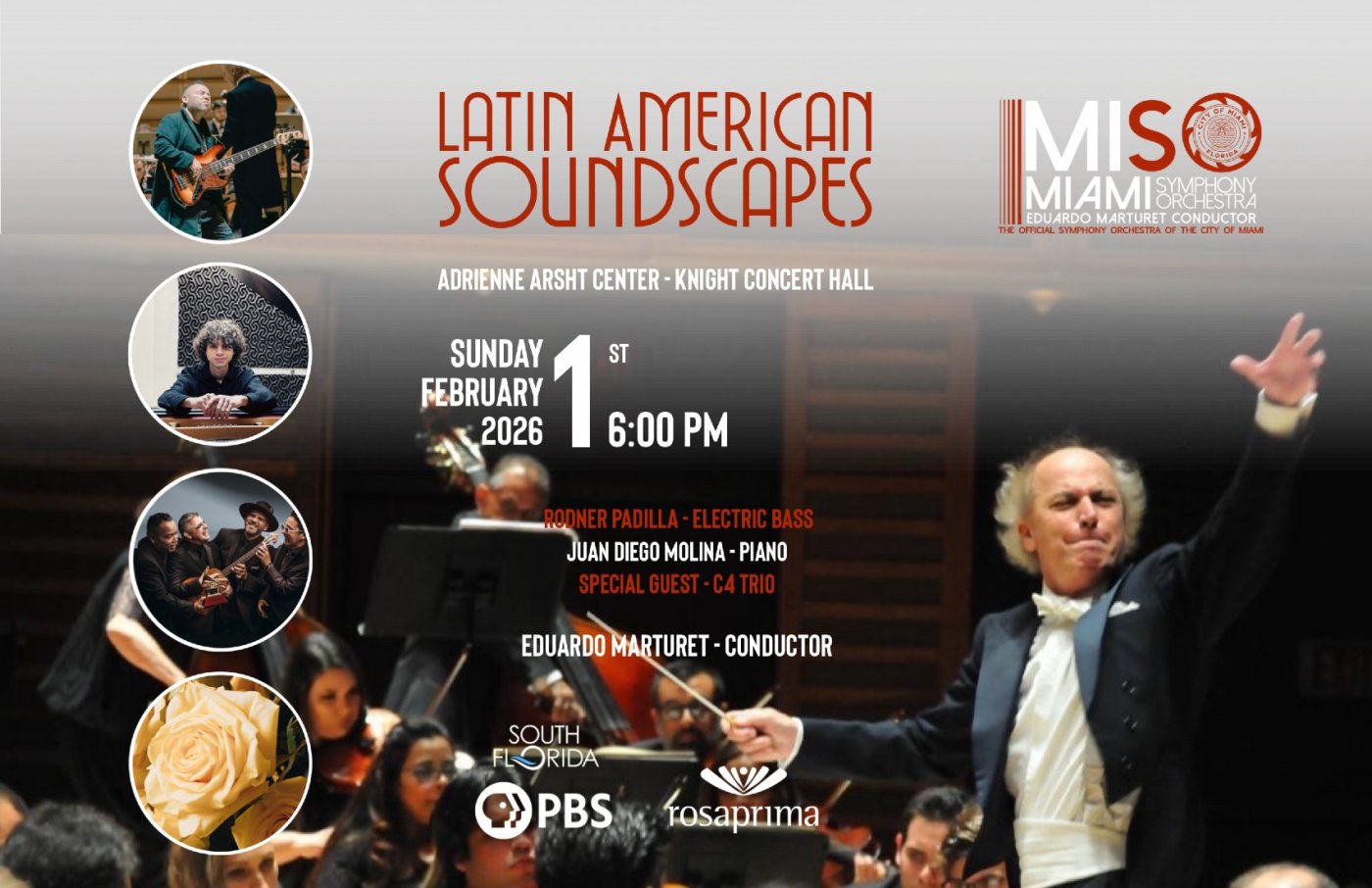 On February 1, the Miami Symphony Orchestra presents Latin American Soundscapes at the Knight Concert Hall—an exhilarating celebration of the region’s rich musical heritage. Led by Maestro Eduardo Marturet, the evening features captivating performances by electric bass virtuoso Rodner Padilla, and pianist Juan Diego Molina, blending beloved classics with exciting new premieres that showcase the vibrant spirit and cultural depth of Latin America. The U.S. premiere by Federico Vollmer and arranged by Eduardo Marturet “Jarro Mocho”, the world premiere of Rosa Prima by Dr. Santiago Bonora, alongside favorites like Márquez’s Danzón No. 2.