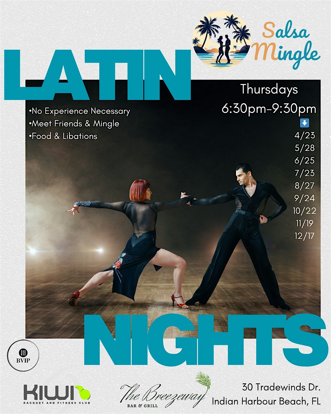 .Salsa Mingle will be at The Breezeway Bar and Grill located at Kiwi Racquet and Fitness Club. Join the fun!!