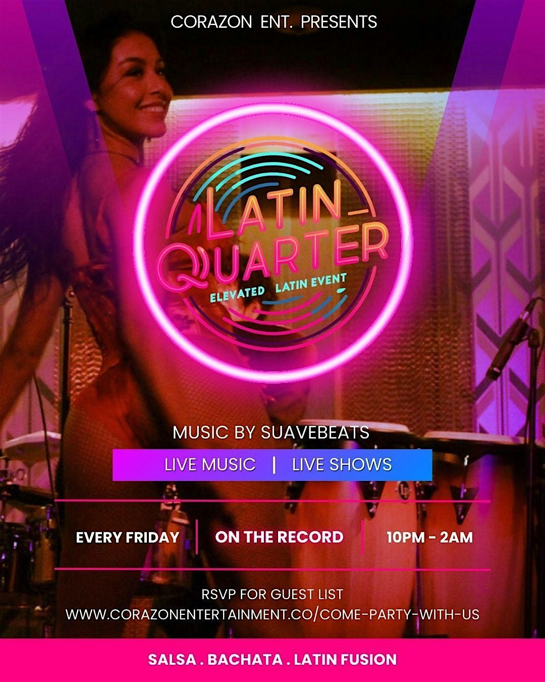 Welcome to the Latin Quarter Friday Live Performance and Dance Party Experience at On The Record! Get ready to dance the night away every Friday. Join us for an electrifying evening filled with live music, vibrant rhythms, and non-stop fun. Don't miss out on this unforgettable event where you can let loose and enjoy the best of Latin music. See you there!
