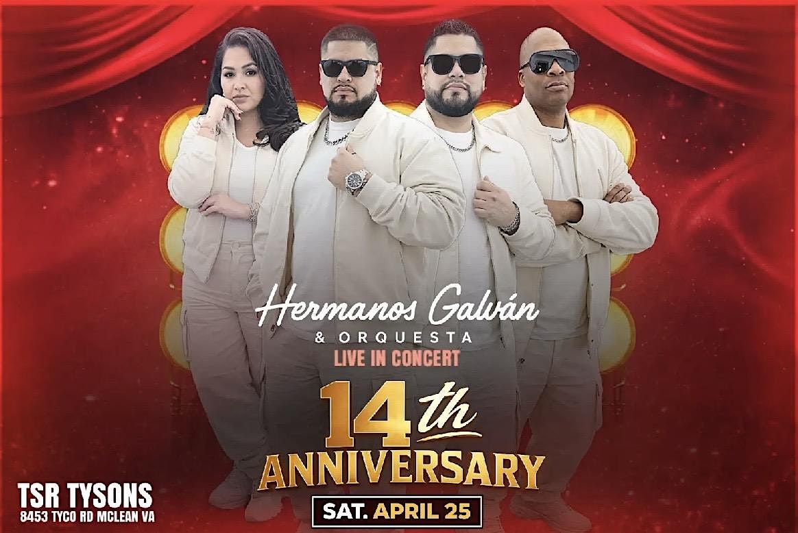 Get ready to celebrate 14 amazing years of Los Hermanos Galvan & Orquesta live at THE SALSA ROOM TYSONS! Join us on April 25, 2026 at 8:00 PM (Eastern Time) for a night full of salsa, dancing, and good times. Don’t miss out on this epic anniversary party—bring your friends and let’s make it unforgettable!