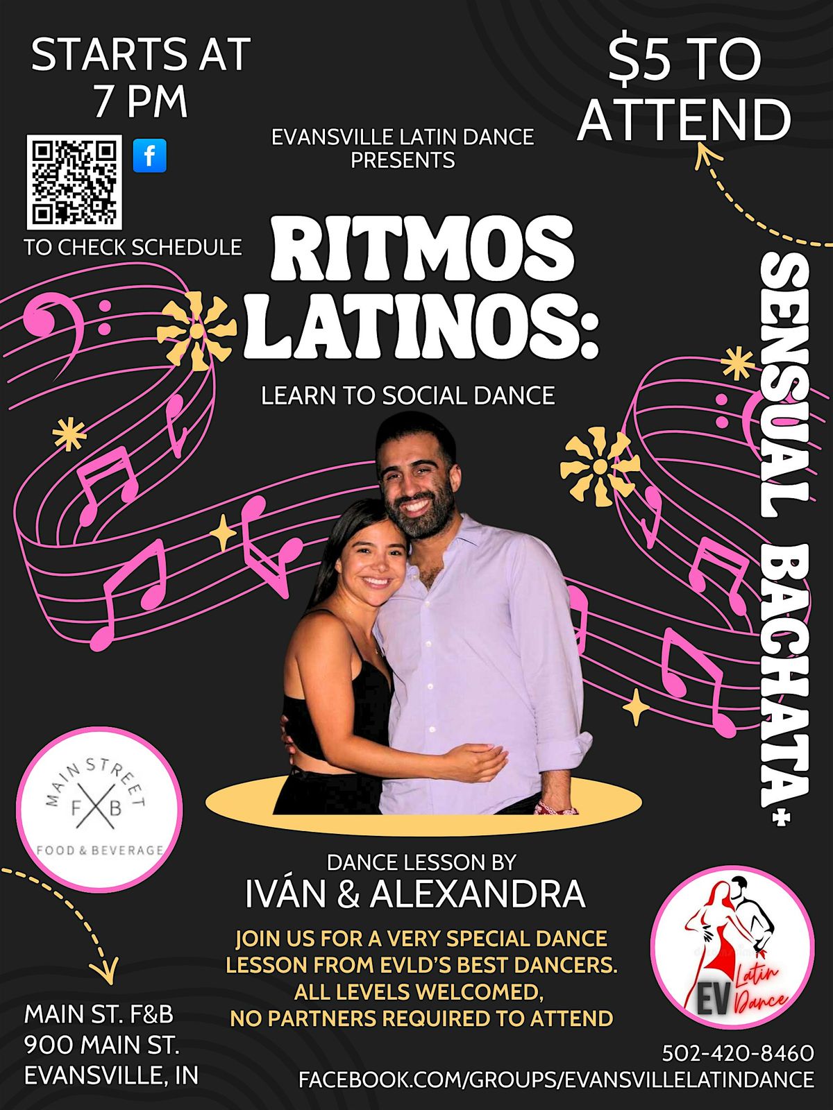 Evansville Latin Dance is thrilled to host a unique Ritmo Latinos: Learn to Social Dance class at Main Street Food and Beverage — taught by the incredible Iván Rodríguez and Alexandra Ramirez!