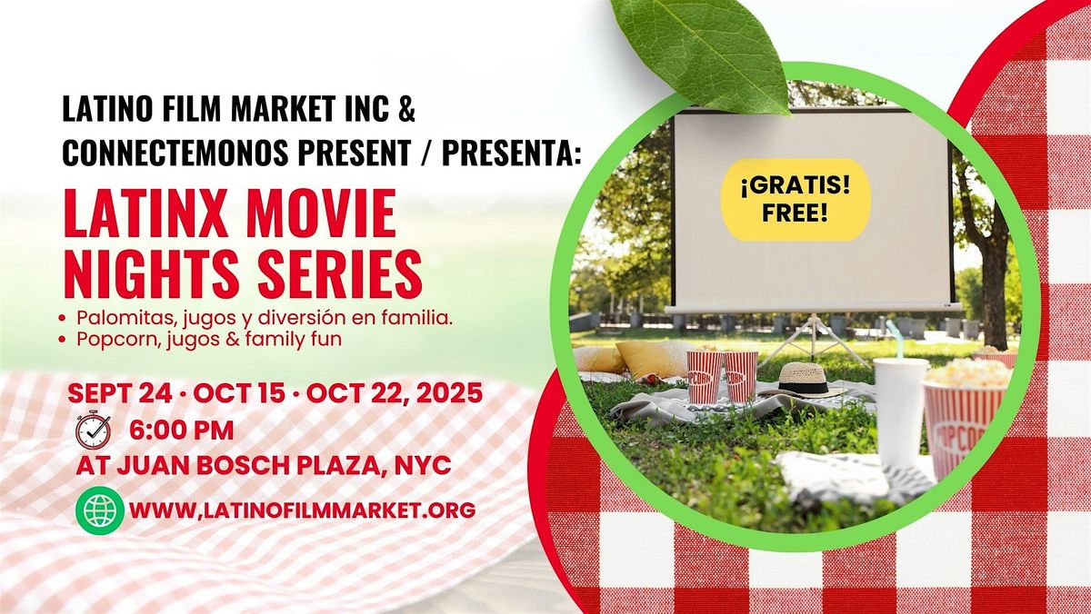 Join us for the Latinx Outdoor Movie Nights Series at Juan Bosch Plaza! 🎬✨ A free community celebration of culture, family, and togetherness under the stars. Enjoy popcorn, juice and unforgettable moments. Don’t forget to bring your chairs and a blanket for comfort!