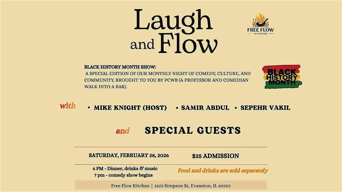 Join us for Laugh & Flow, a monthly night of comedy, culture, and community brought to you by PCWB (A Professor and a Comedian Walk Into a Bar), hosted at Free Flow Kitchen in Evanston.