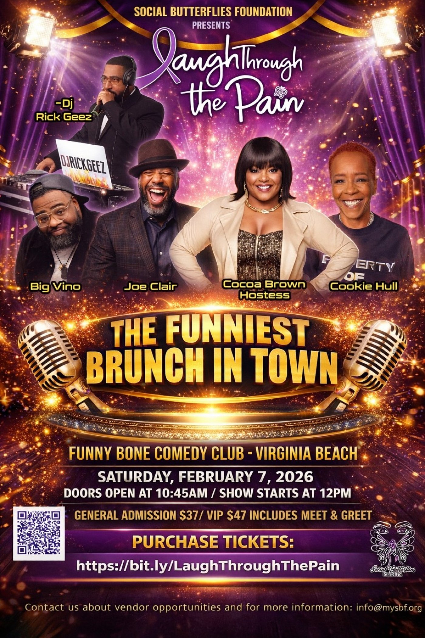 Join Social Butterflies Foundation for an uplifting afternoon of comedy and community supporting lupus and fibromyalgia thrivers. Hosted by Cocoa Brown, a Newport News native, actress, and comedienne, the show features Joe Clair (legendary stand-up and former BET Rap City host), Cookie Hull (20+ years of comedy excellence), and Big Vino (Comedic Therapy). Tickets: GA $37 | VIP $47 (includes Meet & Greet). Proceeds support free programs and services for individuals living with lupus and fibromyalgia.