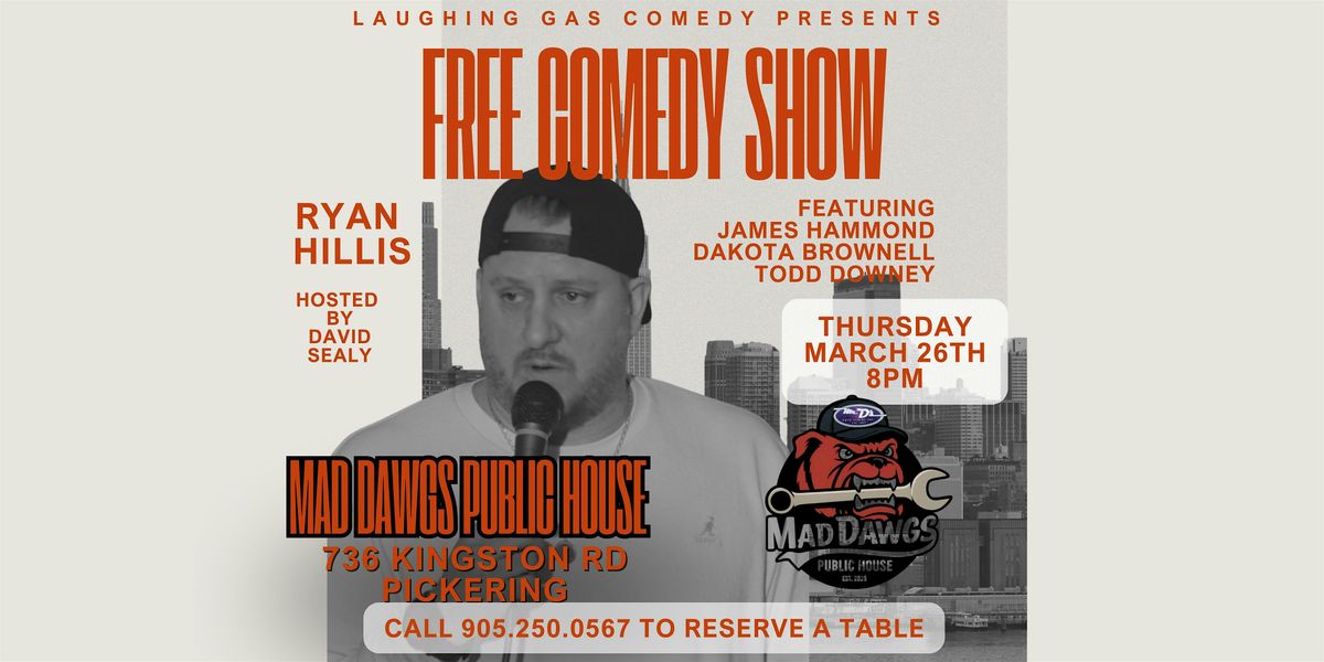 Get ready for a night full of laughs! Join us in person at Mad Dawgs Public House for a hilarious stand-up show featuring the one and only Ryan Hillis. Bring your friends, grab some good food, bring good vibes and enjoy a comedy experience that'll leave you smiling for days. Don't miss out on this awesome FREE EVENT!