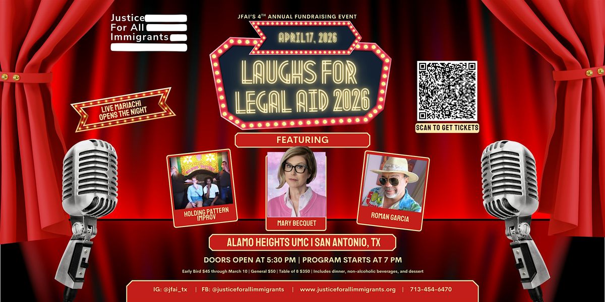Laughs for Legal Aid 2026 returns on Friday, April 17, 2026, at Alamo Heights UMC in San Antonio. As JFAI builds on a decade of standing alongside immigrant children and families, this evening advances that mission with heart, humor, and urgency.