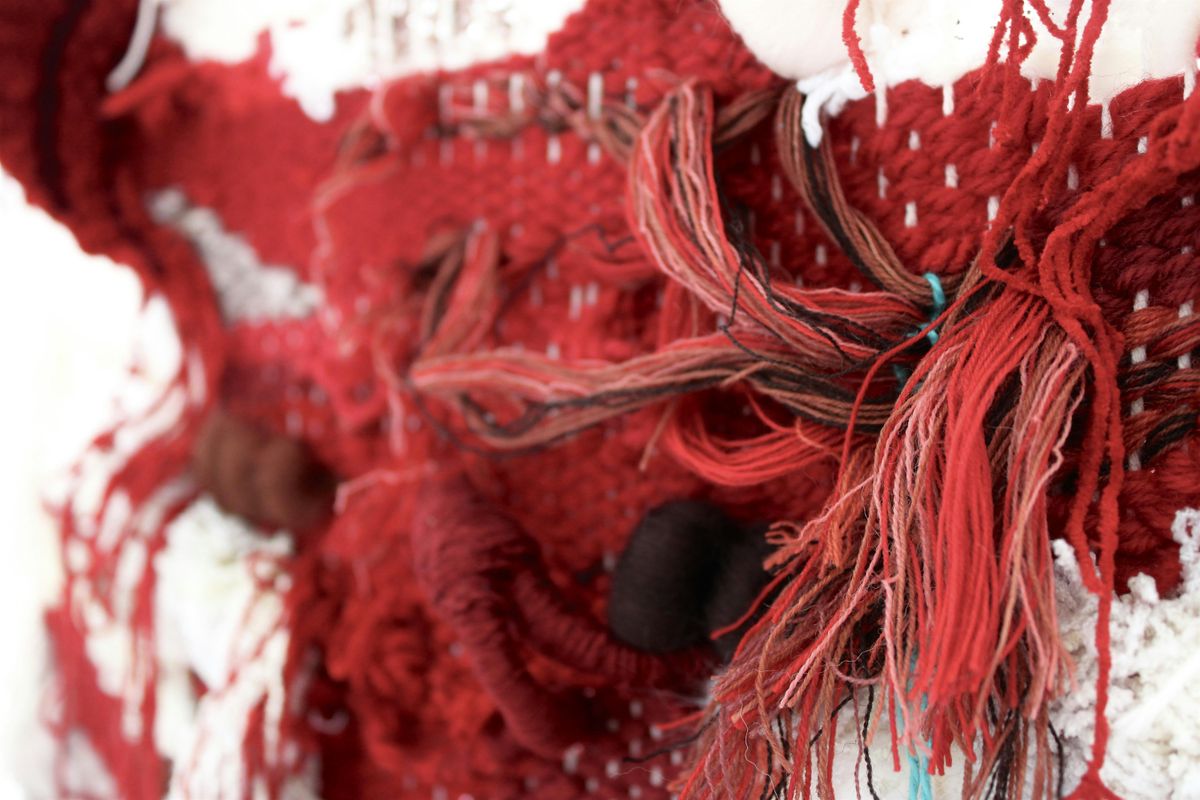 This practice blends boundaries between self and environment, reflecting on the pressures in which we are formed. Working through composition with painting, strata and self-portraiture manifest themselves as tapestries twisted and knotted intuitively to represent the layering of land. It is a collaboration between maker and material, the agency of the medium slowly taking over.