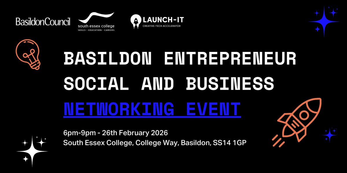 This February, Basildon Council in partnership with South Essex College is delighted to invite you to our social and business networking event! Serving as a celebration of entrepreneurship in Basildon town centre, we have a jam packed schedule of business networking, our 'How to Find New Customers in 2026' workshop, and the opportunity to watch some Dragon's Den style live business pitches. Showcasing some of the newest digi-tech businesses based in Basildon and wider Essex area, this is a business networking event that is not to be missed.