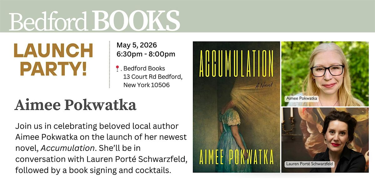Join us in celebrating beloved local author Aimee Pokwatka on the launch of her newest novel, Accumulation. She’ll be in conversation with Lauren Porté Schwarzfeld, followed by a book signing and cocktails.