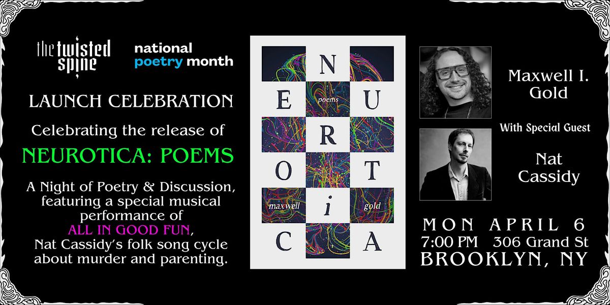 Join us on April 6, 2026 at 7:00 PM for this special event. NEUROTICA author Maxwell I. Gold will be joined by author Nat Cassidy (I Know a Place) for a discussion, reading, and special musical performance of Nat's folk song cycle, ALL IN GOOD FUN. This is a night you won't want to miss!