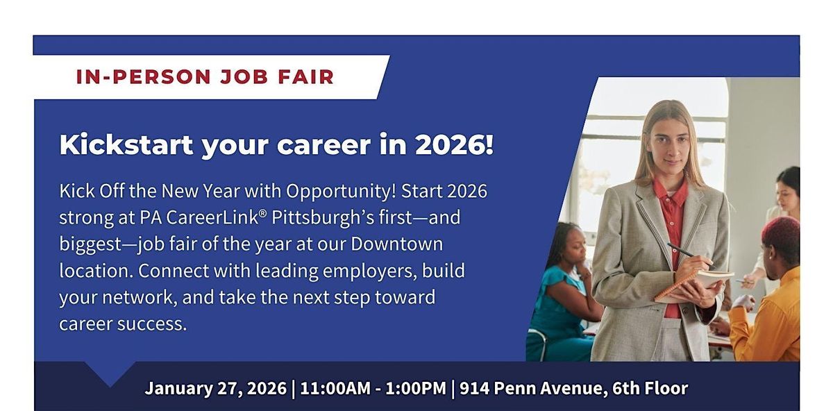 Kick Off the New Year with Opportunity! Start 2026 strong at PA CareerLink® Pittsburgh’s first—and biggest—job fair of the year at our Downtown location. Connect with leading employers, build your network, and take the next step toward career success.