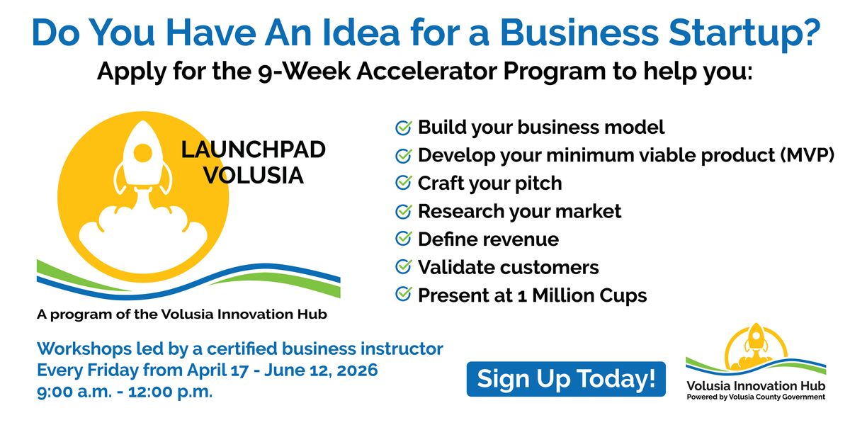 LaunchPad Volusia is a 9-week accelerator program led by a certified business instructor that occurs every Friday from 9:00 a.m. to Noon from Jan. 23, 2026 to March 20, 2026.