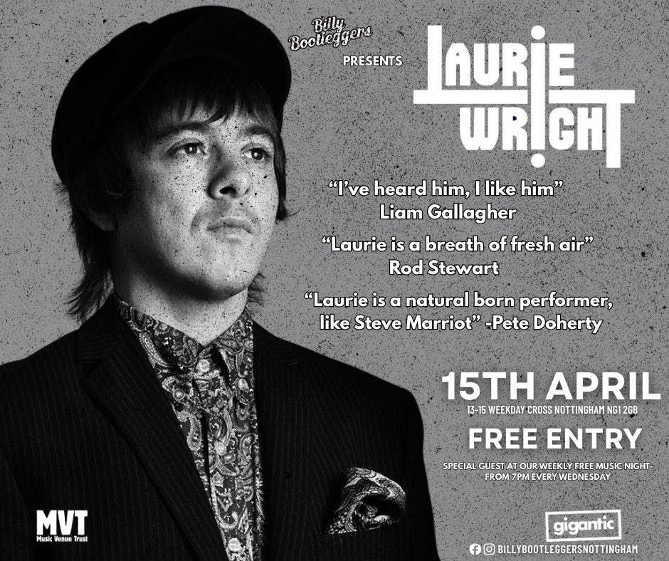 WE ARE THRILLED TO HAVE LAURIE WRIGHT COME TO BILLY'S!Laurie Wright is widely acclaimed for intense live shows, frequently performing in Camden and selling out venues. Described as "a force of nature" and a "natural born performer". He has just been picked out to play Steve Marriott in a brand new film about The Small Faces.