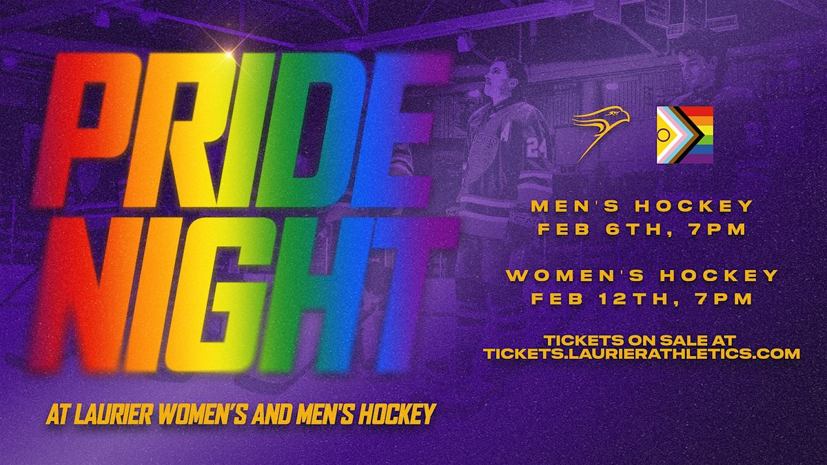 Wilfred Laurier University is offering free tickets to Spectrum community members to attend their Pride Nights! Men's hockey is on Friday, February 6th, 2026 at 7pm (link to that event here), and women's hockey is on Thursday, Februrary 12th, 2026 at 7pm.