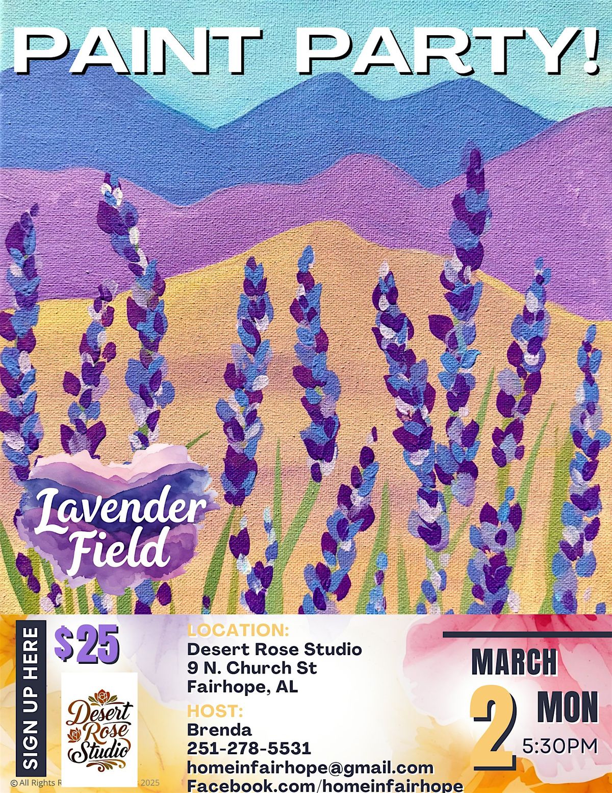 Get ready for a fun, in-person paint party surrounded by the calming vibes of beautiful lavender fields! Whether you're a beginner or a pro, this event is all about creativity and good times. Bring your friends, enjoy some laughs, and take home your very own lavender masterpiece. No stress, just paint, sip, and vibe with us. Can't wait to see your colorful creations!