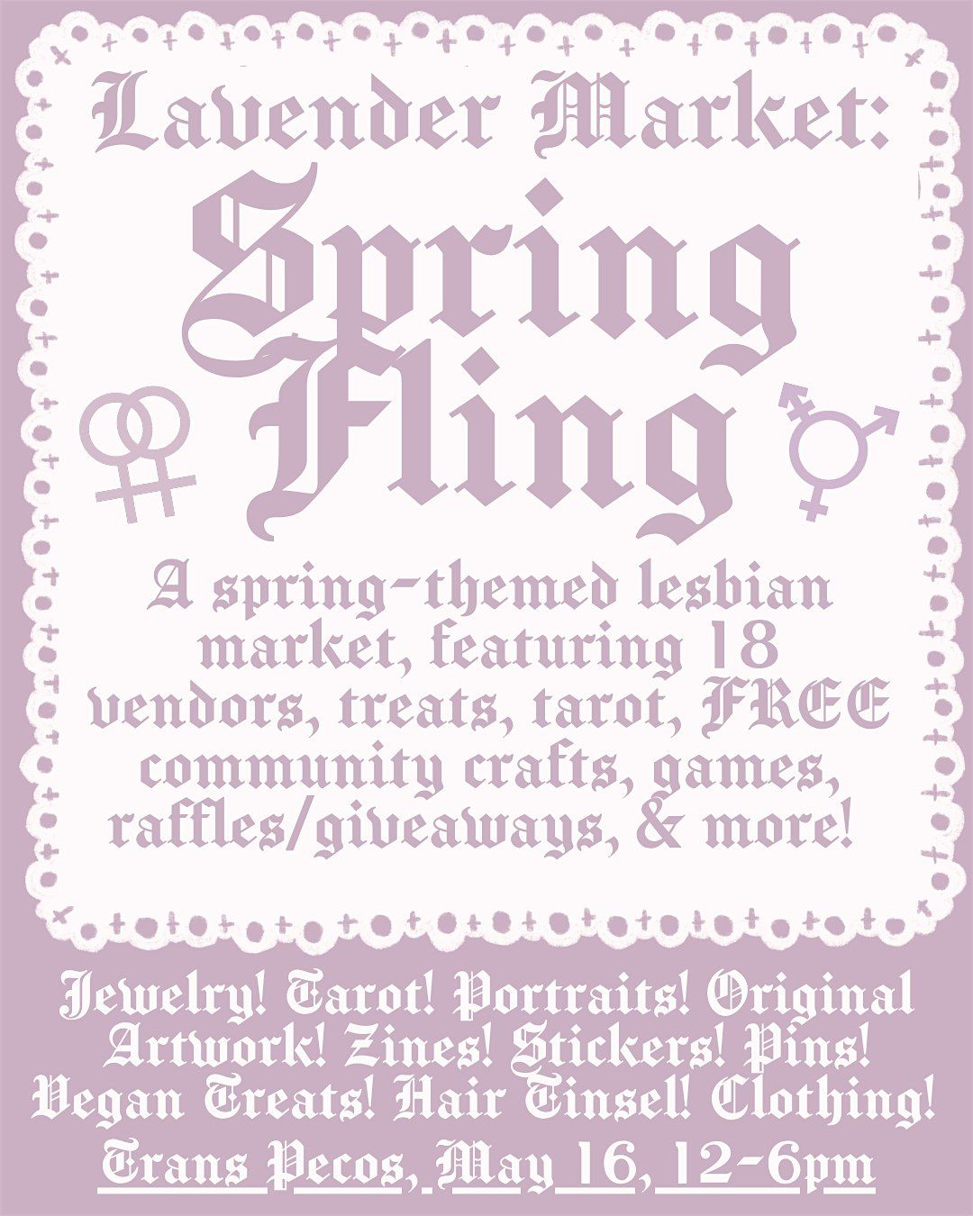 Join us May 16th for our spring edition of Lavender Market, and first official outdoor market of the year! Featuring 18 lovely vendors, community crafts (we're making fairy wands and flower garlands!), tarot, raffles/giveaways, games, and yummy treats... you won’t want to miss it! Bring a date, some friends, or just yourself ;)