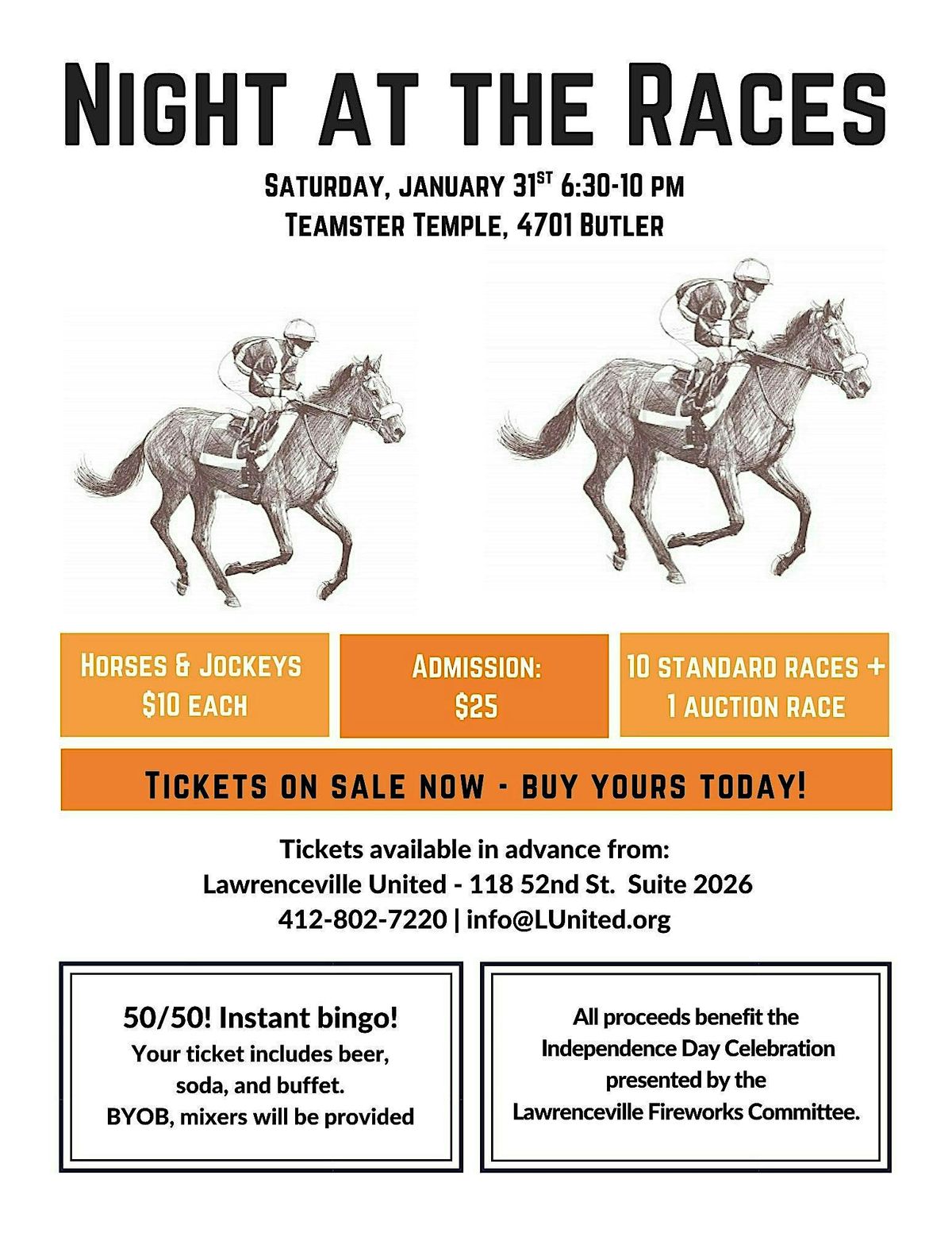 Ticket includes: admission, beer, soda, & dinner buffet. Guests are welcome to bring their own drinks and snacks as well. There are 10 horse races + 1 auction race. Horse betting is $2/bet, plus lots of other small games of chance, including 50/50, Instant Bingo, and more. For questions, please contact Lawrenceville United at 412-802-7220 or [email protected].