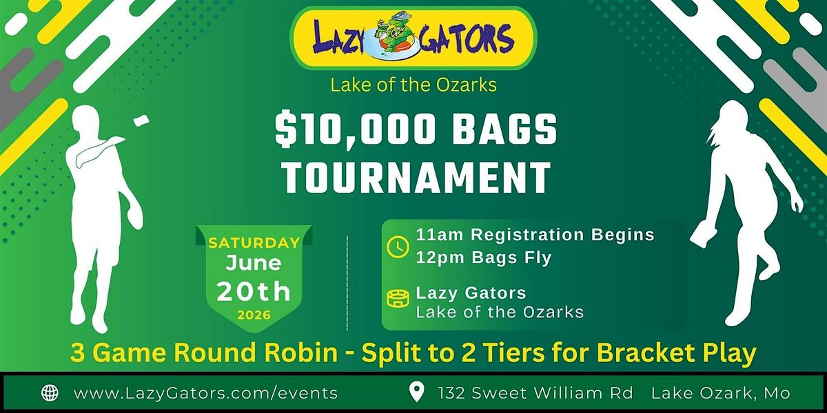 Join us for the Lazy Gators $10,000 Bags Tournament on Saturday, June 20th, at the beautiful Lake of the Ozarks!