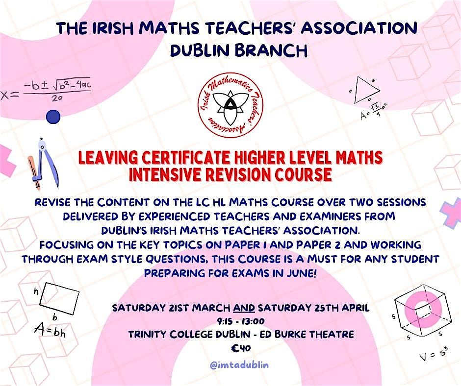 Over two weekends experienced teachers and examiners will cover the main topics on the Leaving Certificate course by working through examples from Paper 1 and Paper 2 in a revision booklet produced specifically by teachers in the IMTA Dublin Branch for LC HL Maths students. The examples will help students revise the course, point out key mistakes to avoid and give information on marking. This event is a must for any LC HL students wishing to revise efficiently and effectively in the lead up to LC 2026.