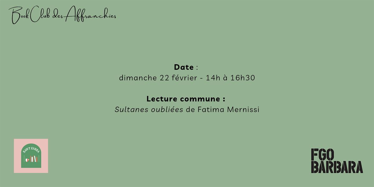 Le Book Club des Affranchies revient le 22 février avec une lecture commune : Sultanes oubliées de Fatima Mernissi. Il n'est pas nécessaire d'avoir lu le livre. Quelques extraits seront envoyés en amont du book club et serviront de base à l'échange. Il s'agit d'un book club en mixité choisie (réservé aux femmes et personnes non-binaires). L'entrée est gratuite, mais les places limitées.
