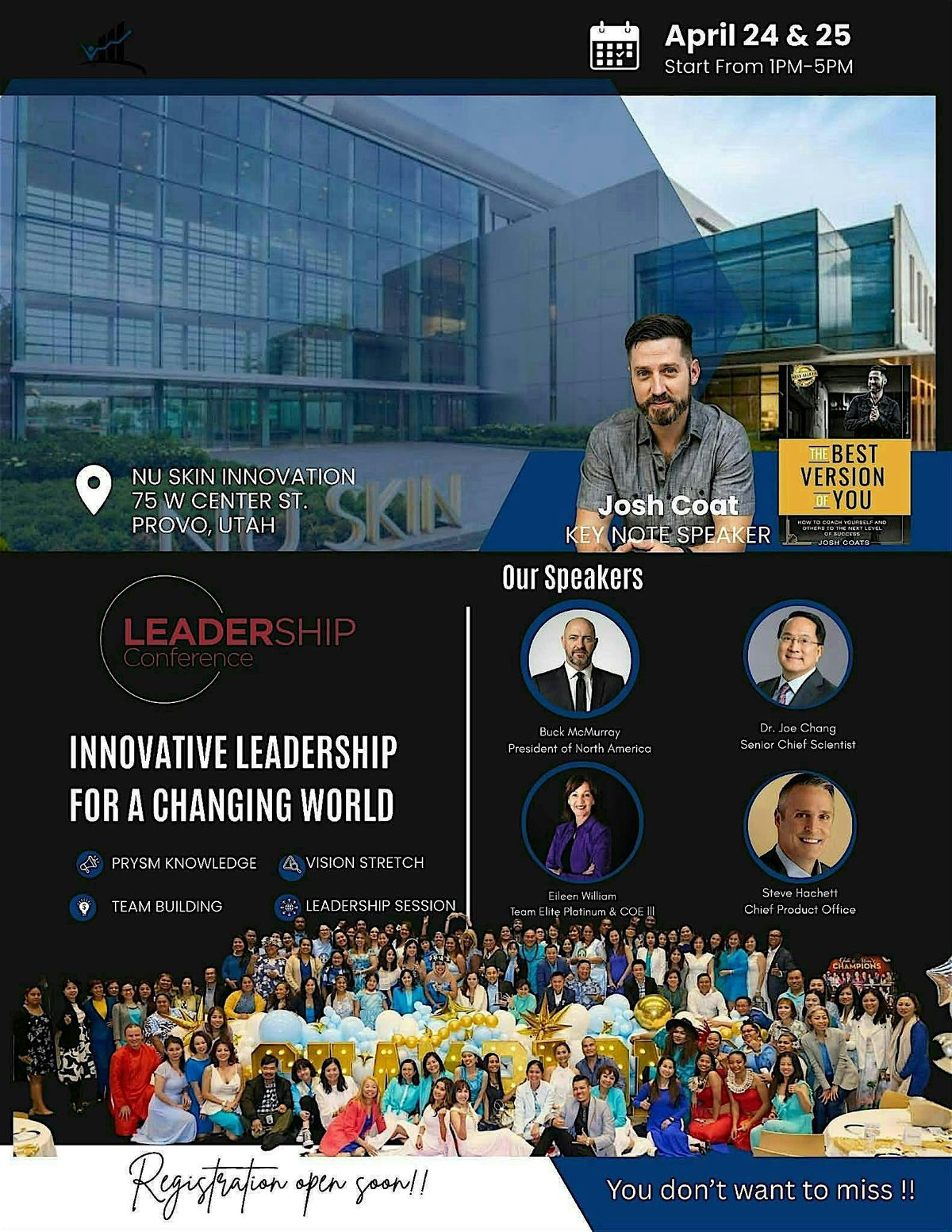 Join us for an inspiring and transformative Leadership Conference on April 24-25, 2026, at the Nu Skin Innovation Center in Provo, UT!
