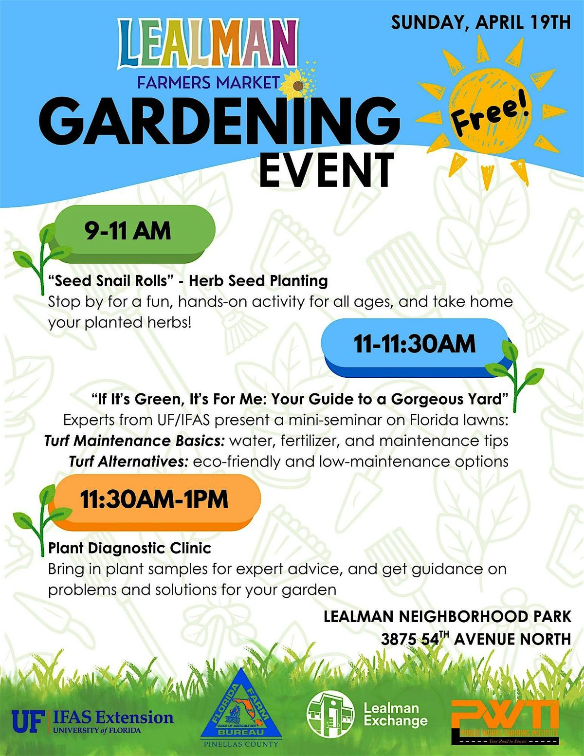 Join us for a special edition of the Lealman Farmers Market — your favorite local market, now with a full morning of FREE hands-on gardening activities, expert seminars, and plant clinics brought to you in partnership with UF/IFAS Pinellas Extension, Florida Farm Bureau, and the Public Works Training Institute!