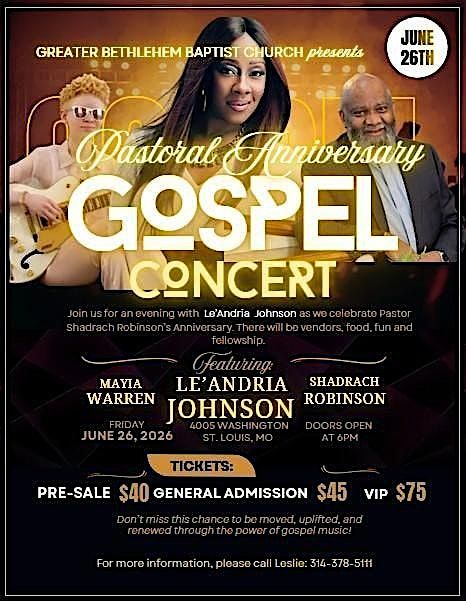 Join us for an evening with Le'Andria Johnson as we celebrate Pastor Shadrach Robinson's Anniversary. There will be vendors, food, fun and fellowship! Pre-Sale starts April 10th! Get your tickets. This event WILL SELL OUT!
