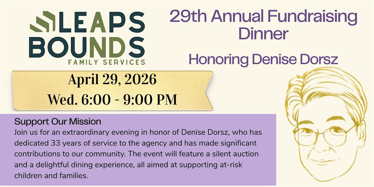 Denise Dorsz previously served Leaps and Bounds Family Services as Executive Director. Through her commitement to the agency she has ensured Leaps and Bounds has grown and prospered. We would like to honor her for dedication, hard work, and vision leading the agency for 33 years with this years dinner event.