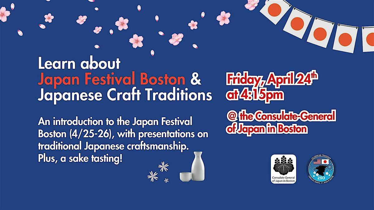 Join us for Cultural & Innovative Fridays at the Consulate-General of Japan in Boston, featuring an introduction to Japan Festival Boston and presentations on traditional Japanese craftsmanship.