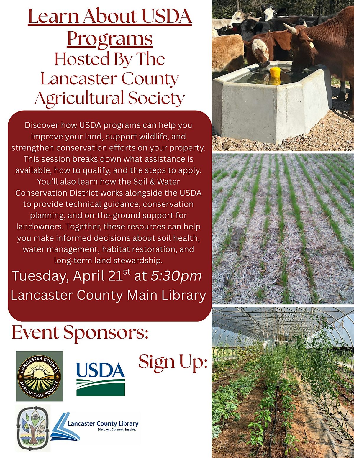 You’ll also learn how the Lancaster Soil & Water Conservation District works alongside the USDA to provide technical guidance, conservation planning, and on‑the‑ground support for landowners. Together, these resources can help you make informed decisions about soil health, water management, habitat restoration, and long‑term land stewardship.