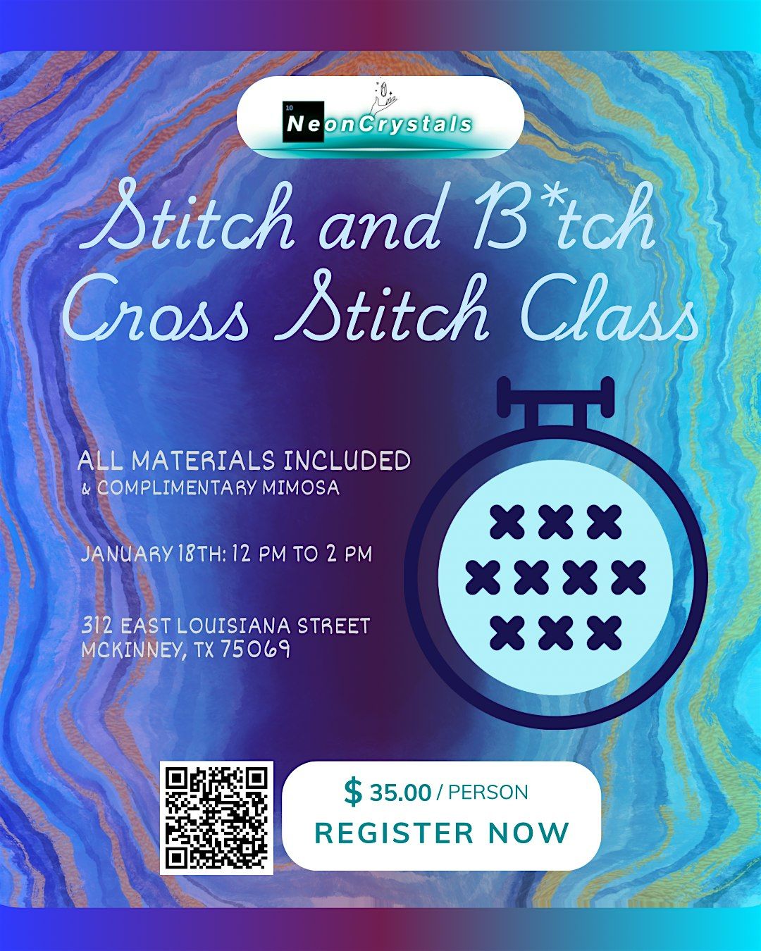 Join us at The Wildflower Production House on February 15, 2026 at 12:00 PM (Central Time) for a fun and creative cross stitching class.