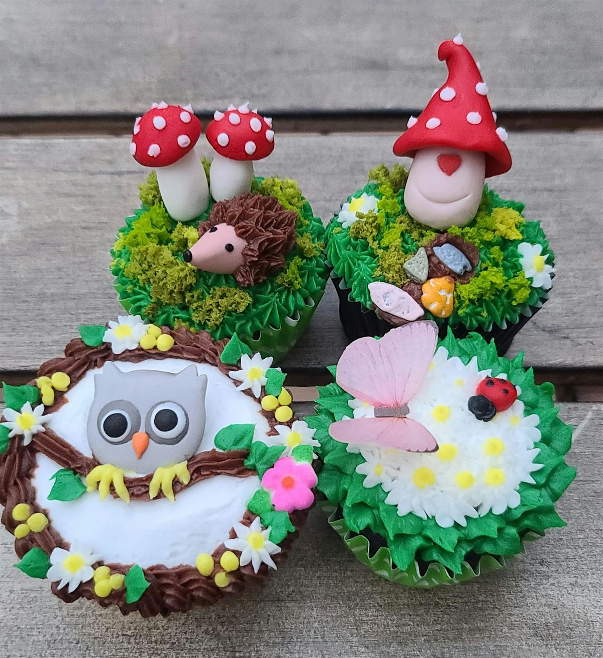 You will be supplied with 2 vanilla and 2 chocolate cupcakes with a carrying box. We will practice some piping skills first before decorating the cupcakes. A little bit of fondant will also be used to create the mushrooms, hedgehog, and ladybug. The owl is a premade royal Icing decoration.