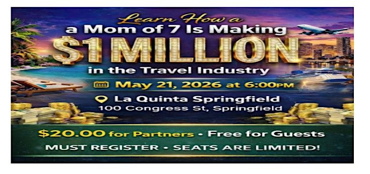 Join us in person to hear the inspiring story of a mom of 7 who built her travel business from the ground up. Learn the tips, tricks, and hustle that took her to $1 million. This is your chance to get up close and personal with real success — no fluff, just the good stuff!