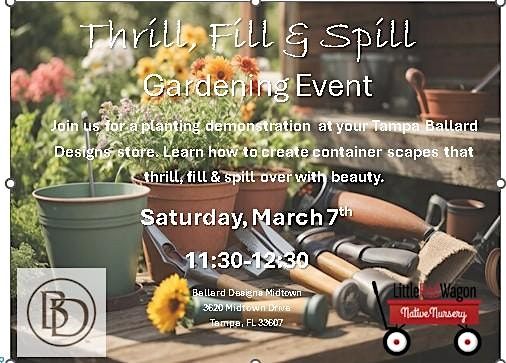 Have you ever wondered how to get a beautiful, balanced planter for your front door or garden? Join us at Ballard Designs where Little Red Wagon Nursery will educate us about Florida Native plants. You will learn how to choose plants that thrive in our part of the state and how to use them to create those beautiful planters. Complimentary treats will be served to enjoy during the presentation!