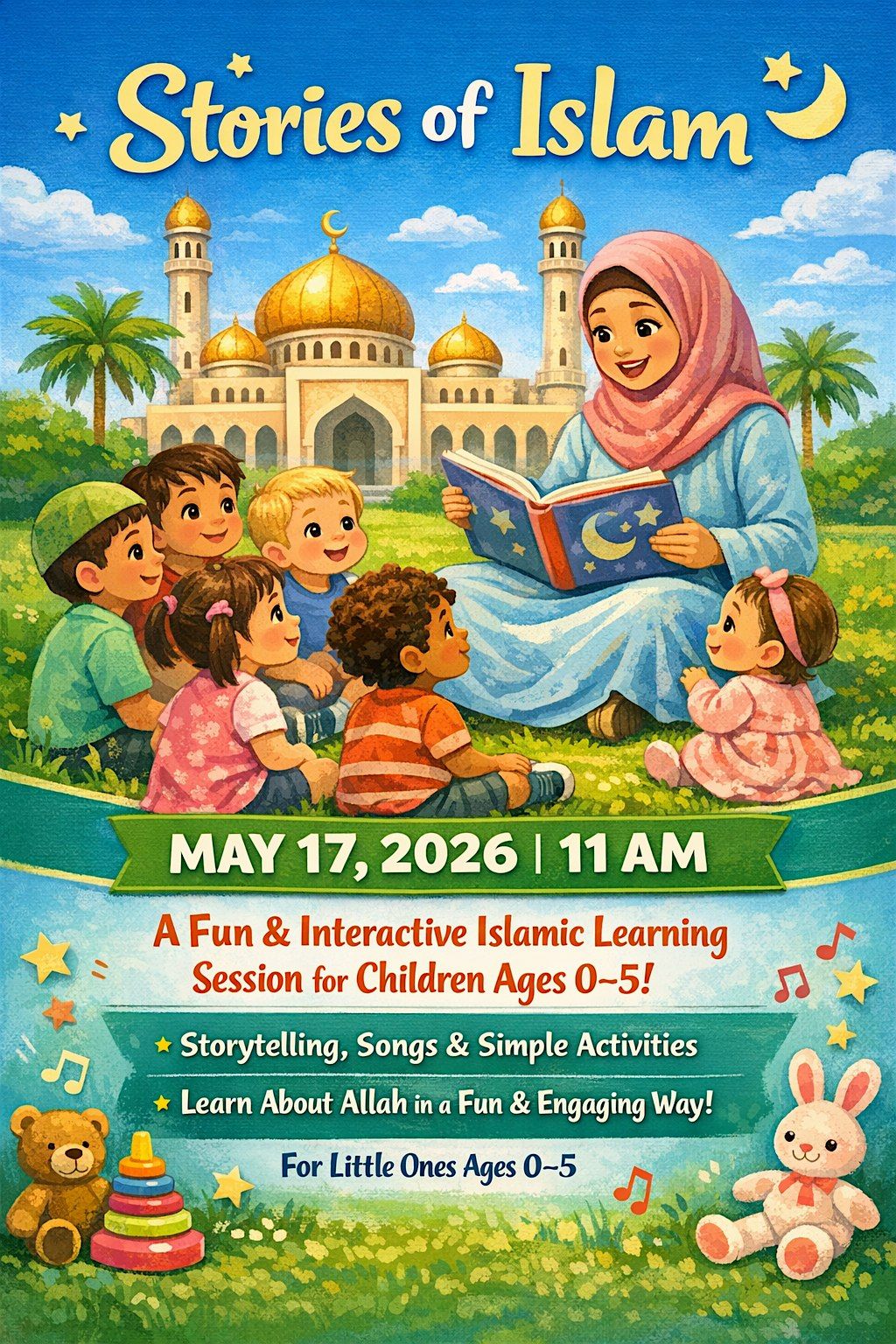 A fun and interactive Islamic learning session for children ages 0–5. The program includes storytelling, songs, and simple activities to help young children learn about Allah in an engaging and age-appropriate way.