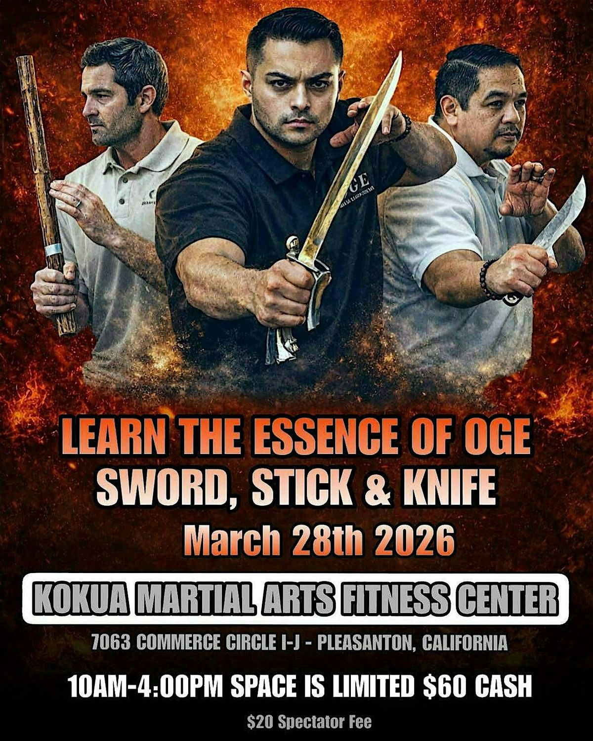 Join us for an intensive OGE weapons seminar focused on stick, sword, and knife applications, hosted at Kokua Martial Arts Fitness Center in Pleasanton, California.
