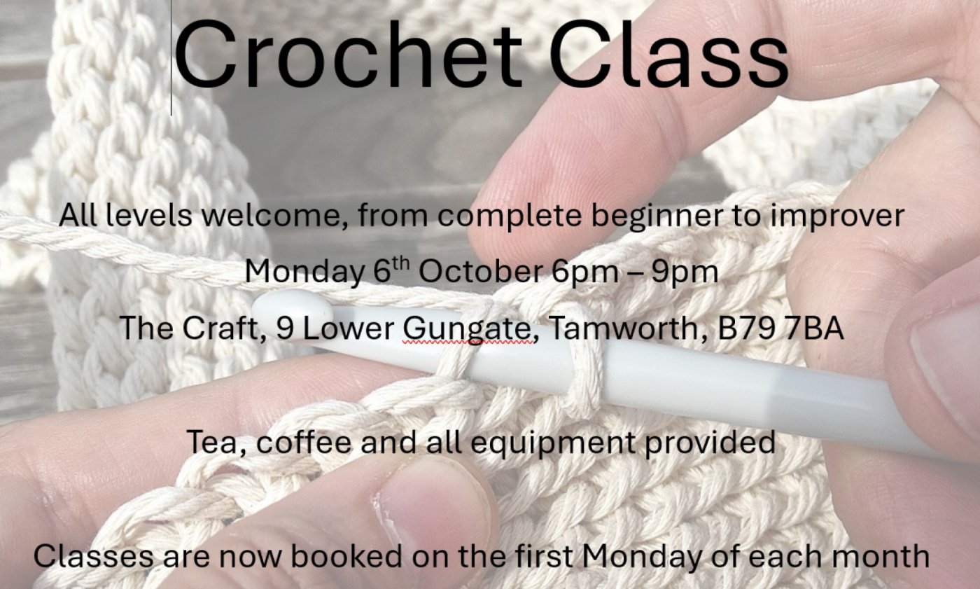 Join me on Monday 6th October 6pm - 9pm as we learn to crochet and you create a coaster to take away with you.Tea coffee and all equipment is provided.