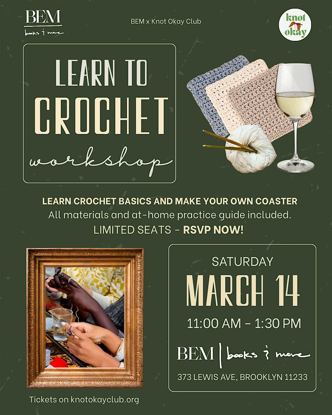 Ready to start your crochet journey? Join us at BEM for a beginner crochet workshop hosted by Knot Okay Club! KOC founder Camryn will lead you through the steps to create your own handmade crochet coaster: a decorative kitchen essential and resting place for your glasses and mugs! π§Ά RSVP TODAY - Limited seats available!