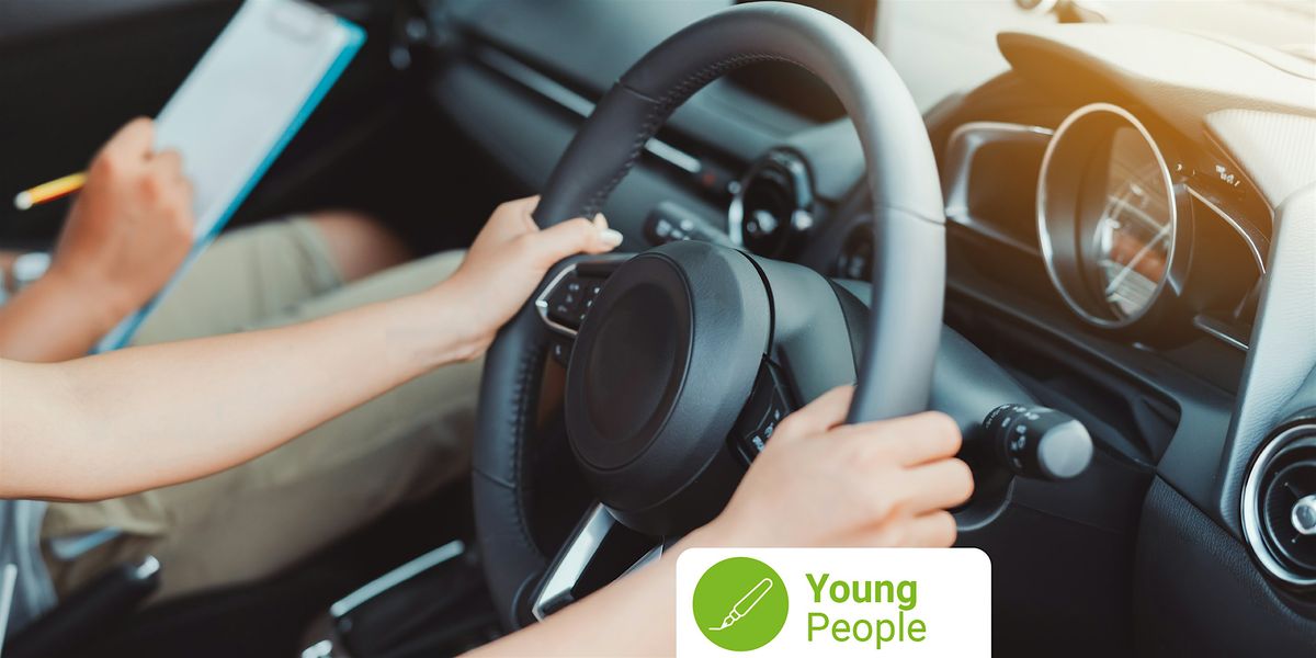 [ Image description:Woman practice driving car exam driver licence control steering wheel education and learn on street road by driving instructor teaching at school drive transportation safety travel, people lifestyle. Text reads, Young People]