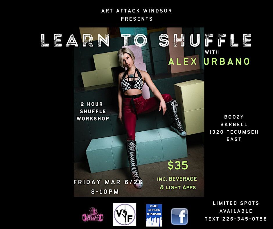 Friday March 6th from 8pm-10pm located at the The Boozy Barbell where for $35 you will get a BEVERAGE, light appetizer and an hour shuffle dance tutorial by the super talented Alex Urbs owner of Vertika Pole Fitness with some dance time after!