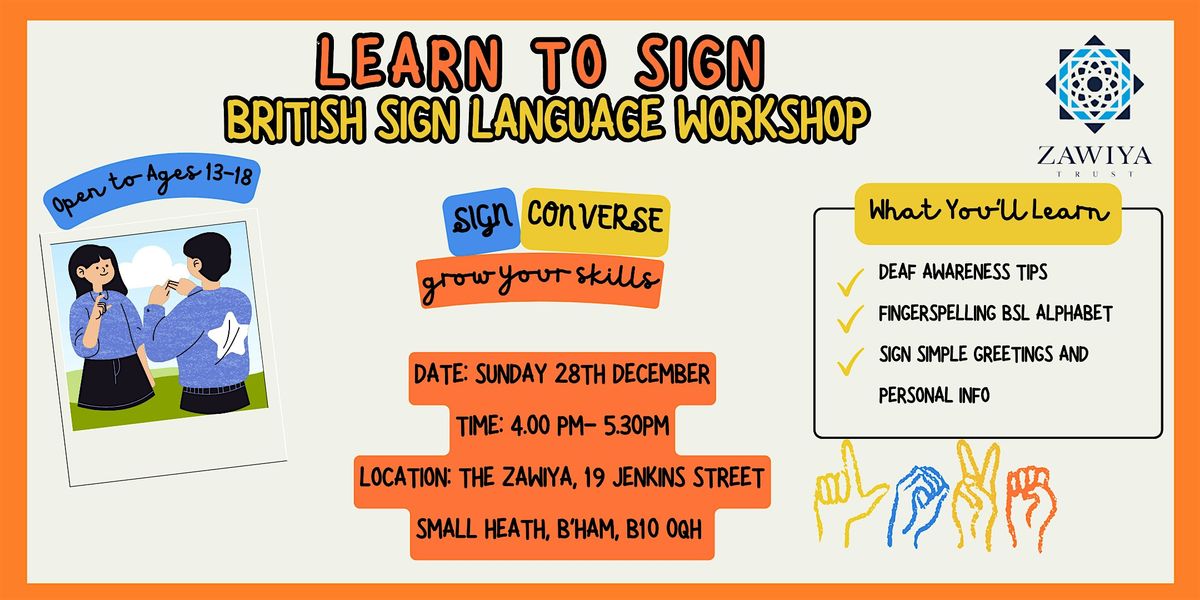 Want to pick up a cool new skill? Join us in person to dive into the basics of British Sign Language! Whether you're chatting with friends or just curious, this event is a fun, friendly way to get started.