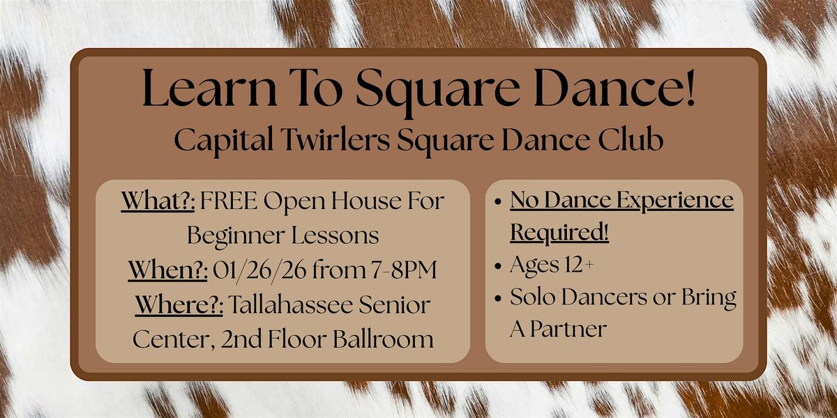 Join the Captial Twirlers for our Learn To Square Dance - Open House! Whether you're a total beginner or just curious, this event is all about fun, laughter, and great company. Bring your friends, wear comfy shoes, and get ready to step, spin, and swing your way through an unforgettable night. Don't miss out on this awesome chance to dive into the world of square dancing!
