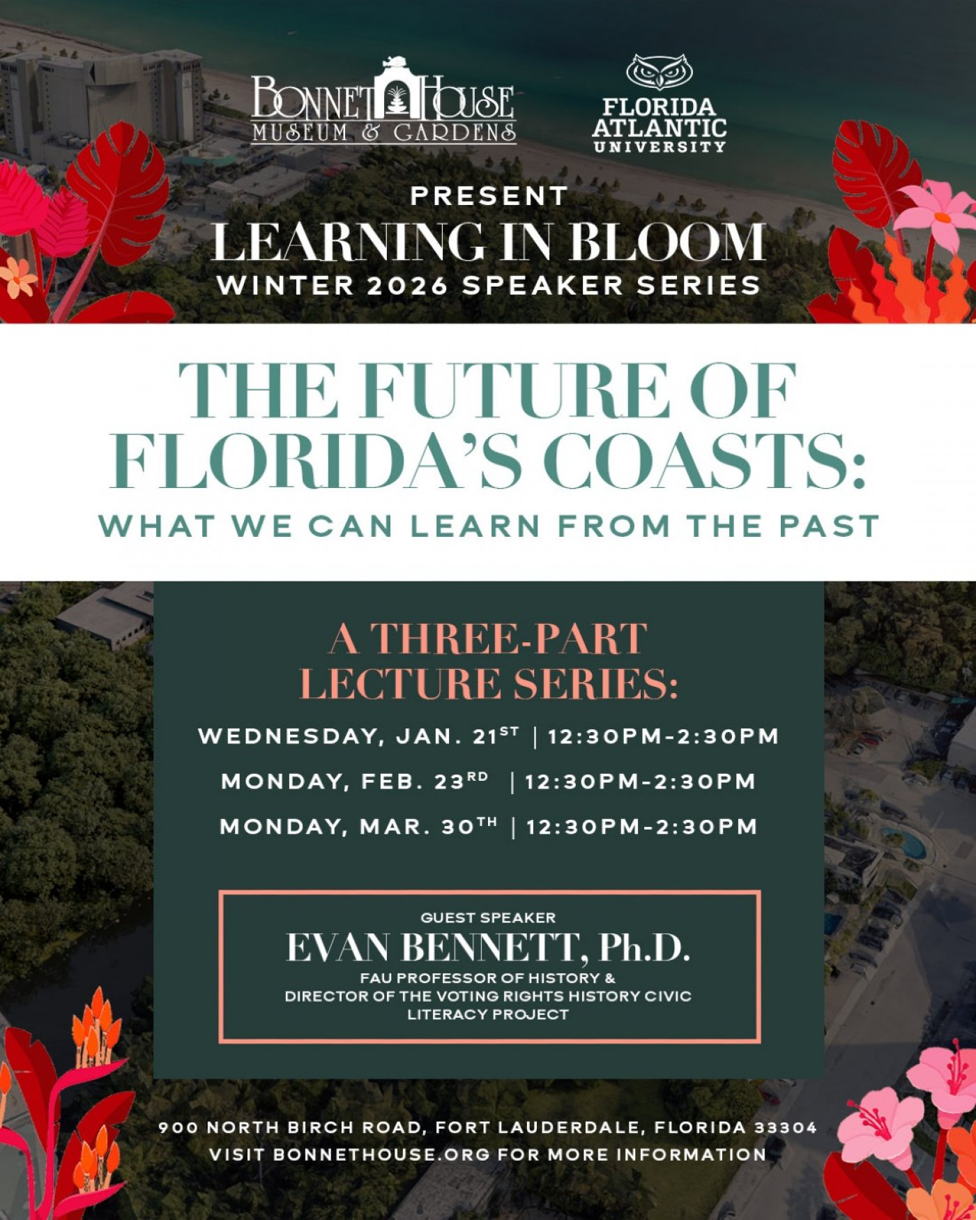 Bonnet House Museum & Gardens is pleased to announce a new three-part lecture series in partnership with Florida Atlantic University (FAU) as part of its 2026 programming. Held on the museum’s historic estate, the series will examine Florida’s coastal history and the evolving relationship between Floridians and the sea over the past 2,000 years. Evan Bennett PhD., FAU Professor of History and renowned historian, will lead the series, titled The Future of Florida’s Coasts: What We Can Learn from the Past.