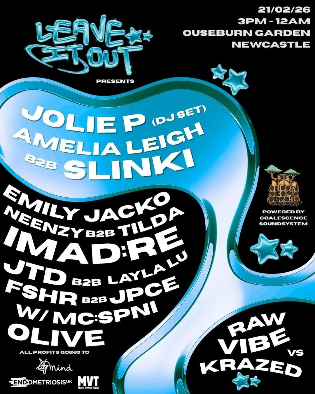 NEWCASTLE. LEAVE IT OUT. OUSEBURN GARDEN. ‧₊˚🩶✩ ₊˚ 🎧⊹♡A day to night multigenre family affair bringing the underground to the forefront. Absolutely stacked with talent across the board all for a good cause.Come shake ya booties on the 21st February 2026 at bag factory as part of a big fat charity bash raising funds for Mind UK, Music Venue Trust and Endometriosis UK. (^з^)-☆If the lineup couldn’t get stacked enough we are bringing TiFfin from @_raw_vibe_ and @djbootyshake and @pb_donk representing @areyoukrazed in a head to head CLASH 🥊Tickets out on RA Disclaimer:
