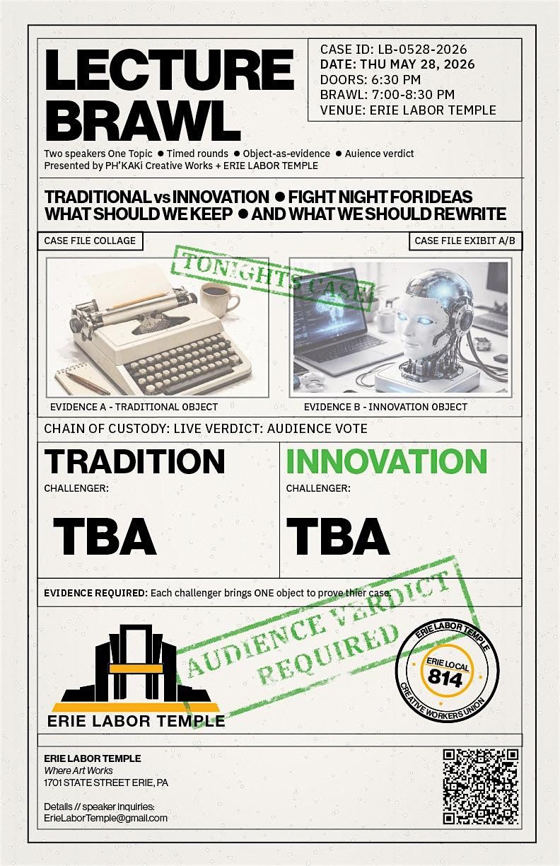 LECTURE BRAWL: Tradition vs. Innovation is Erie Labor Temple’s monthly fight night for ideas. Two brawlers. One case question. Timed rounds with hard rules. An object-as-evidence requirement. A scored winner. And an audience verdict for Best Argument / Best Presenter.
