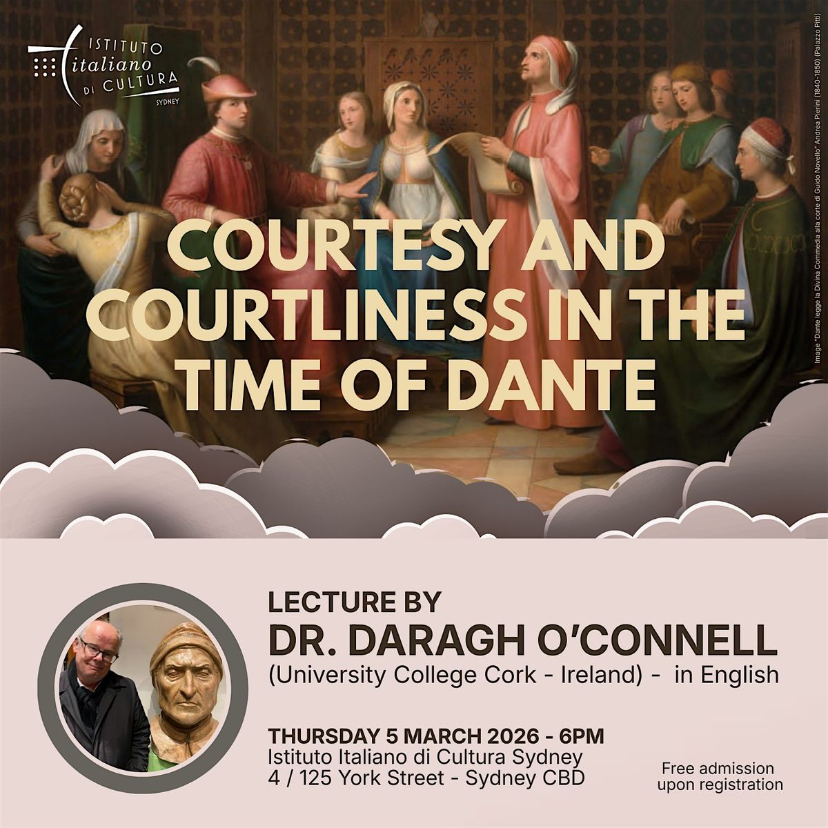 This talk revisits the notion of Courts, Courtliness and Courtesy in Dante Alighieri’s work, and how these play an important function when it came to writing the Divine Comedy. Beginning with a selection of texts from the immediate post-exile period Dr. Daragh O’Connell (University College Cork, Ireland) will map Dante’s own experiences of various courts in central and northern Italy onto his conception of the courtly in Inferno, Purgatorio and Paradiso.